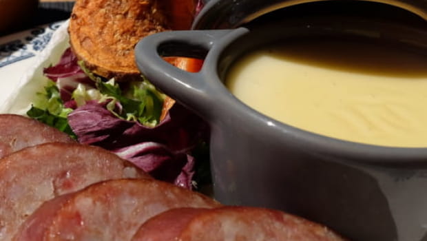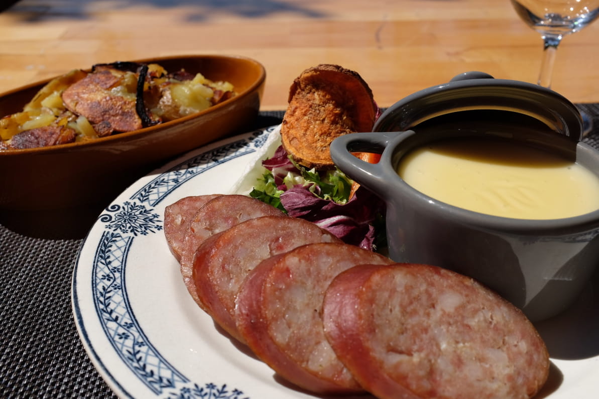 Saucisse de Morteau et pommes de terre à la cancoillotte