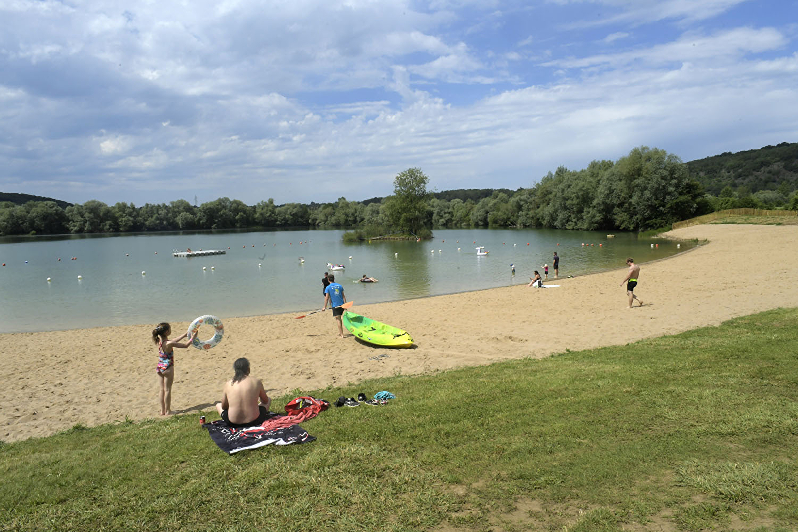 Baignade surveillée (aux horaires d'ouverture, petit et grand bains) ; terrain de beach volley, aire de pique-nique et activités nautiques : paddle et canoë.