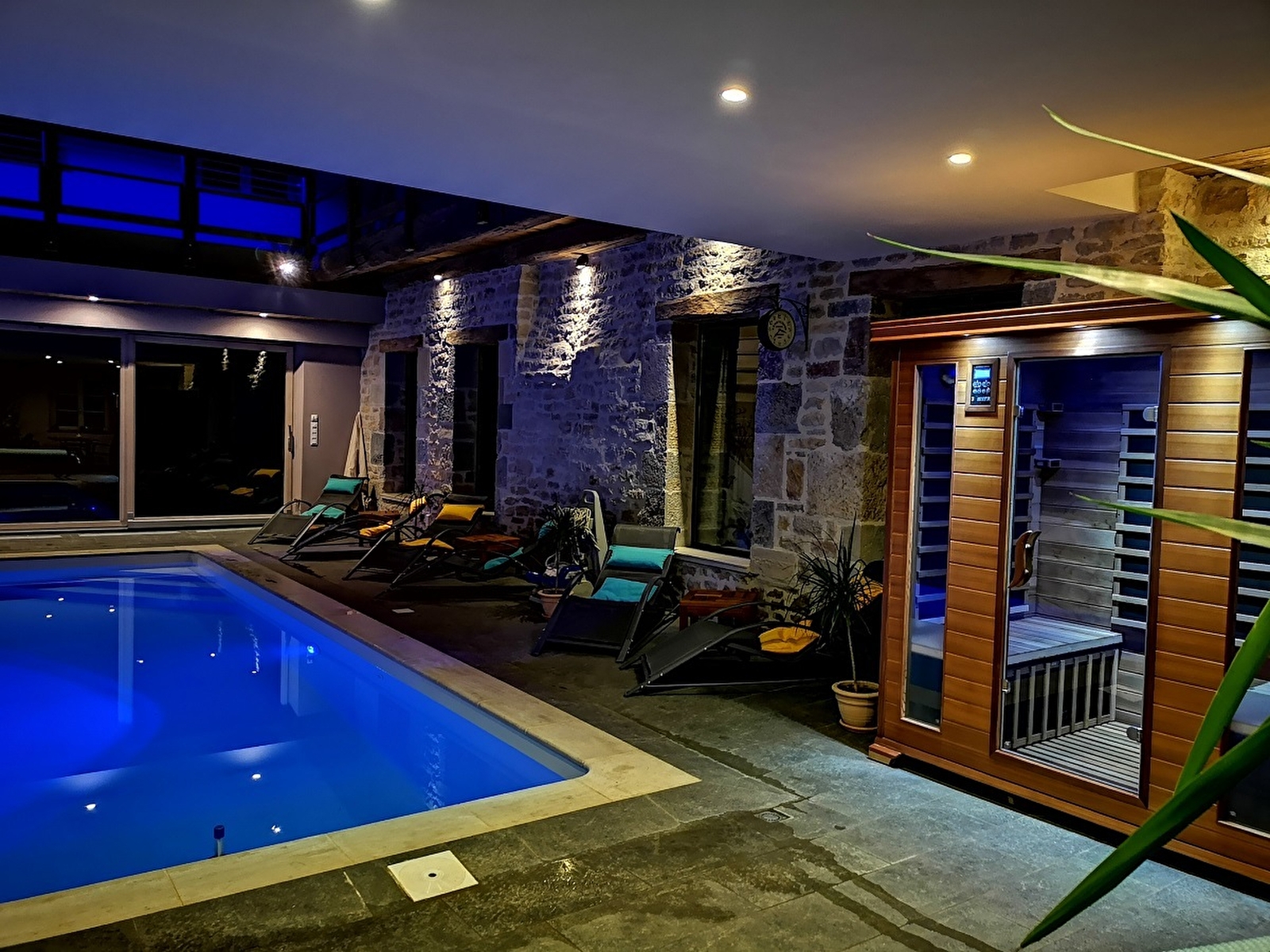 Un endroit où l'on peut se relaxer au bord de la piscine intérieure à l'eau de pluie, chauffée à 28°C toute l’année, avec un traitement par lampes UV (sans chlore ni sel), profiter du sauna infrarouge avec luminothérapie ou se détendre sur la terrasse extérieure tout en profitant de la nature et du terrain de pétanque.