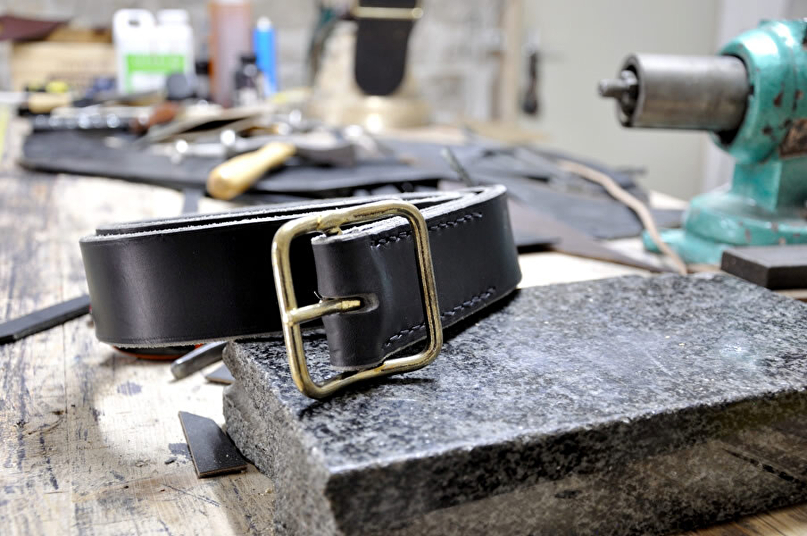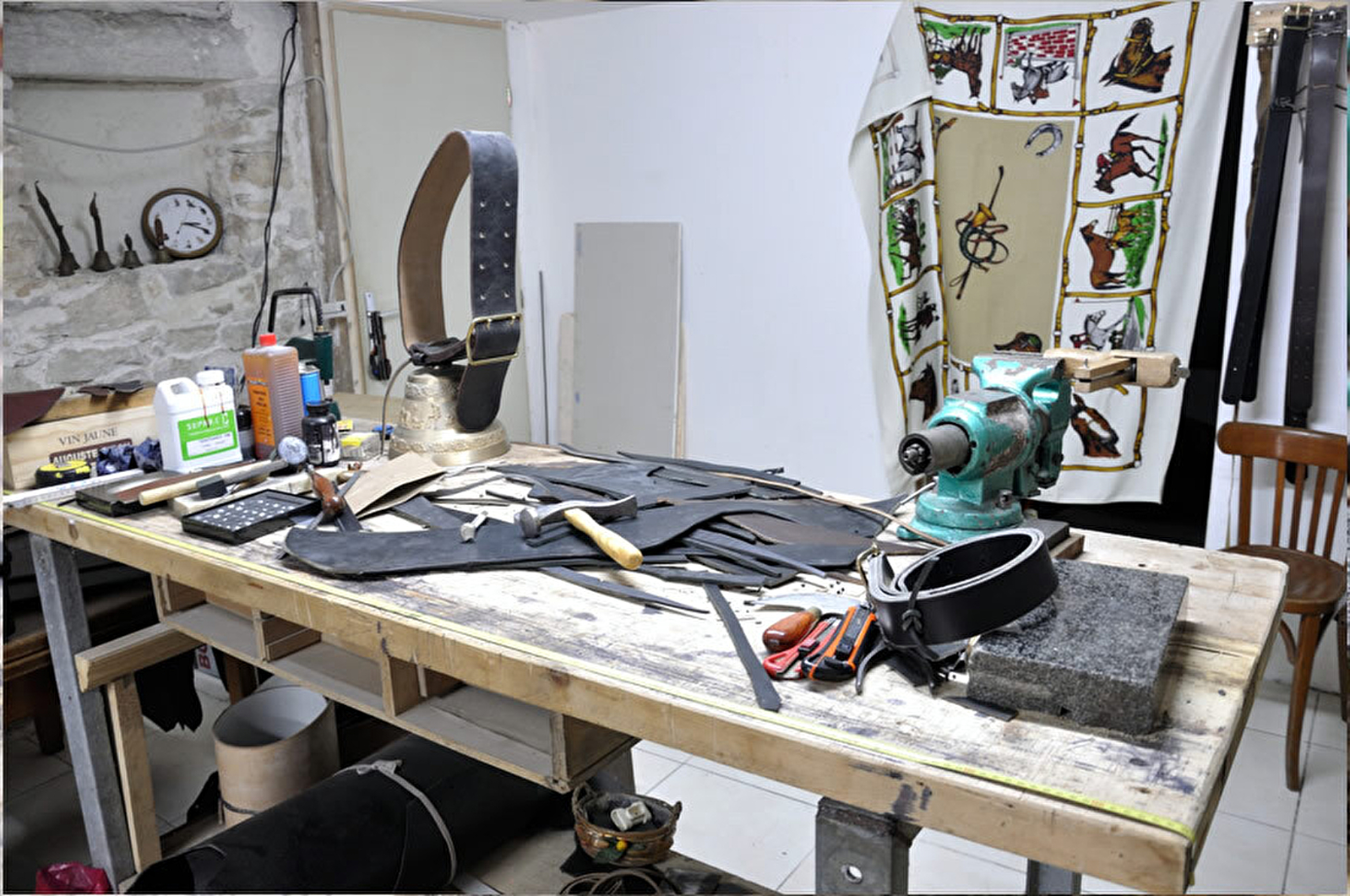 L’atelier du cuir vous fera découvrir les outils et techniques de fabrication des courroies des cloches de vaches, harnachements pour les chevaux, licols des animaux... et même des ceintures. Vous saurez tout de ce savoir faire ancestral : comment couper le cuir avec la demi-lune, comment utiliser une alène... Chaque couture est faite à la main, en utilisant la technique à deux aiguilles dite "point du sellier".