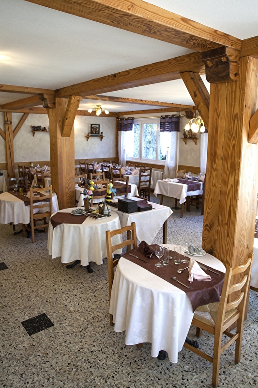 Le marché, le jardin, le terroir... le chef a ses sources de saveurs naturelles ! Voilà pourquoi sa cuisine a l'âme régionale et du caractère. Pour déguster, la salle à manger lumineuse ou bien la terrasse en face de la prairie pour se détendre... toutes les deux avec vue panoramique. Banquets et repas de famille jusqu'à 90 personnes.
